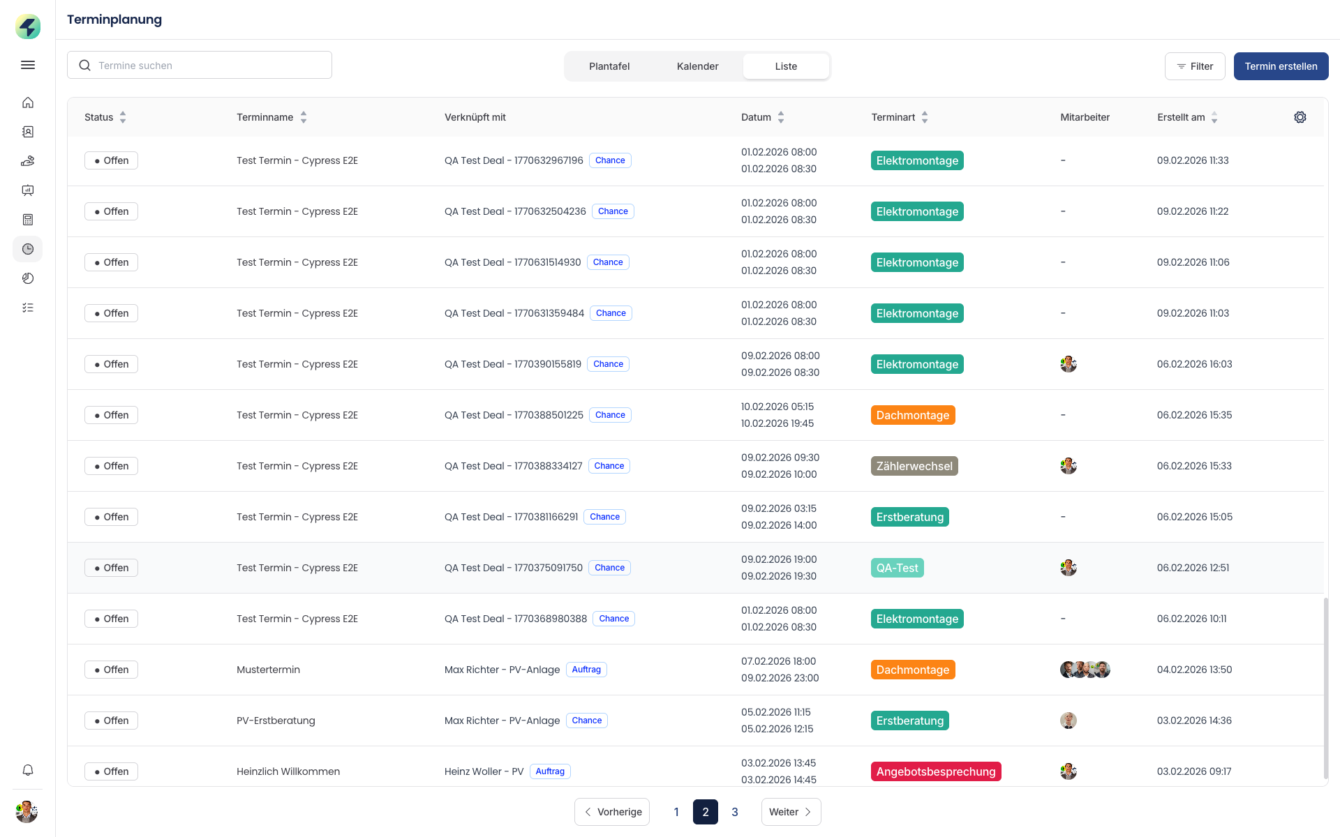 Tabellenansicht der Terminplanung mit Spalten zu Status, Terminen, Mitarbeitern und Zeiten.