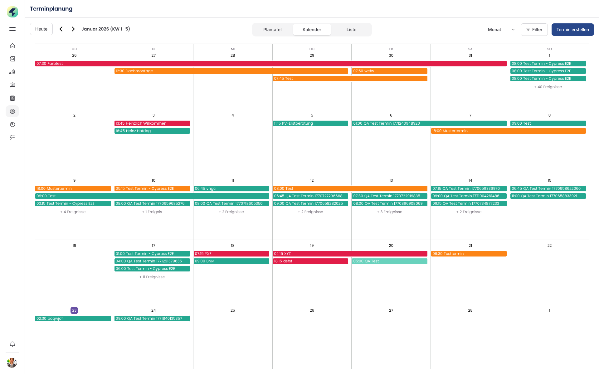 Kalender: Zeigt den ausgewählten Monat (z. B. Jan. 2026) mit farbigen Markierungen für Termine. Klicken Sie auf ein Datum, um Details zu sehen.
