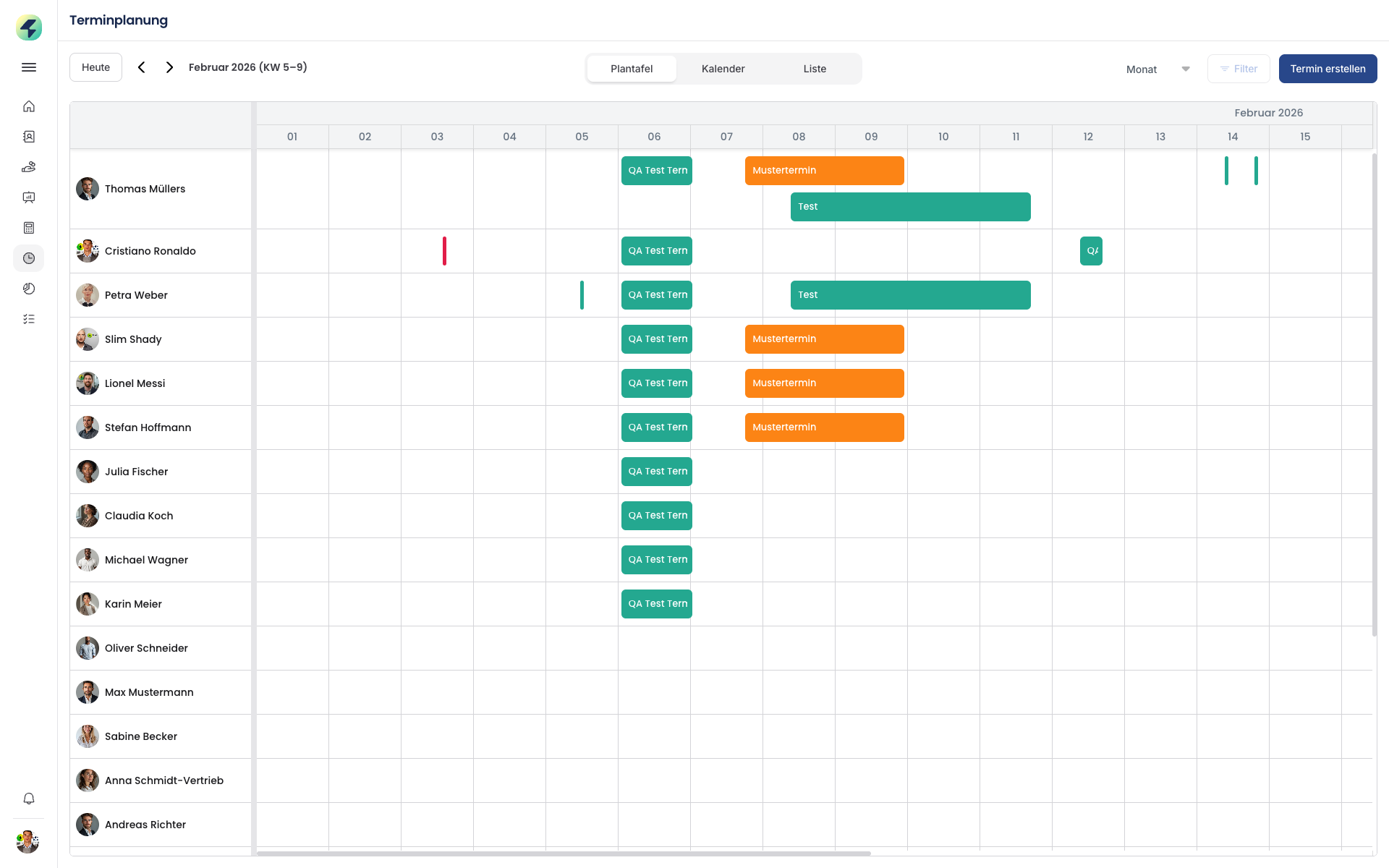 Terminliste rechts: Zeigt Termine des aktuellen Monats oder gefilterten Zeitraums mit Status, Mitarbeitern und Zeiten.