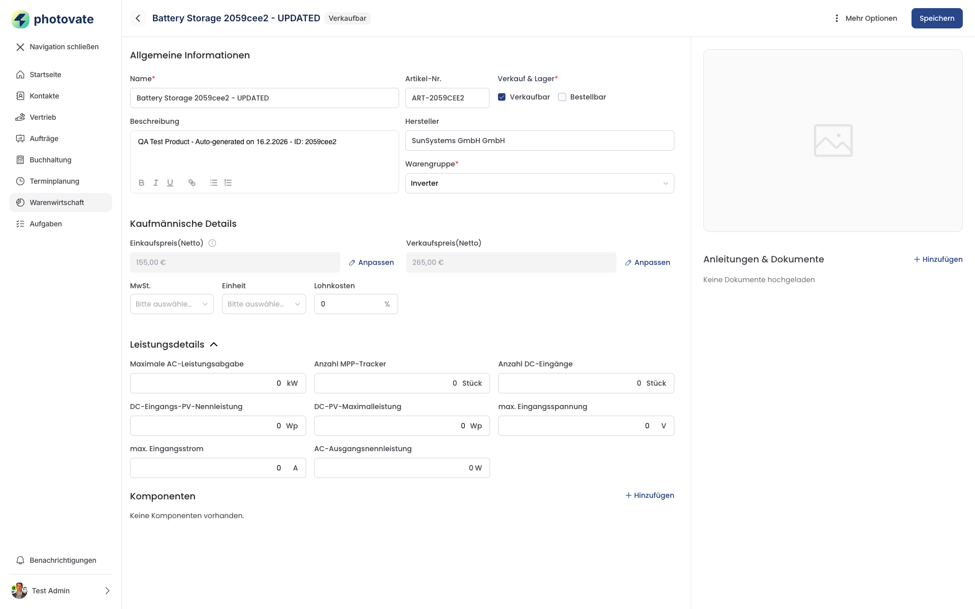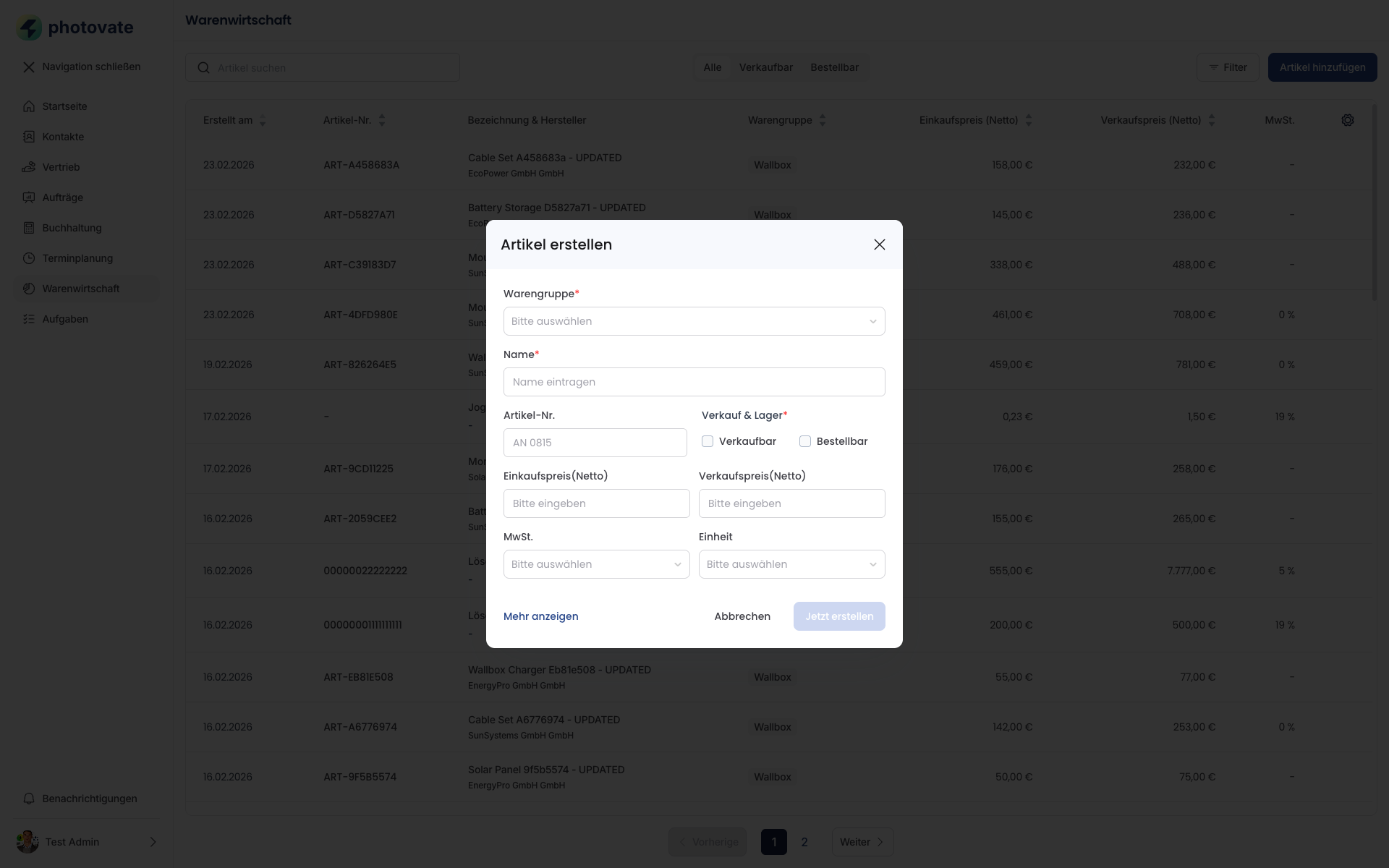 Formular zum Anlegen neuer Artikel mit Pflichtfeldern Artikelnummer, Name und Typ.