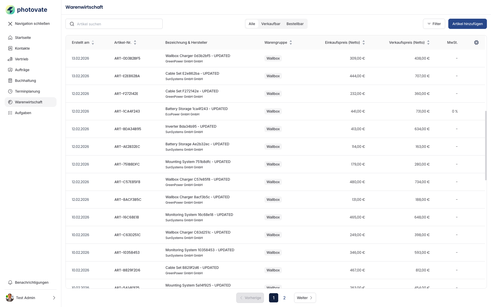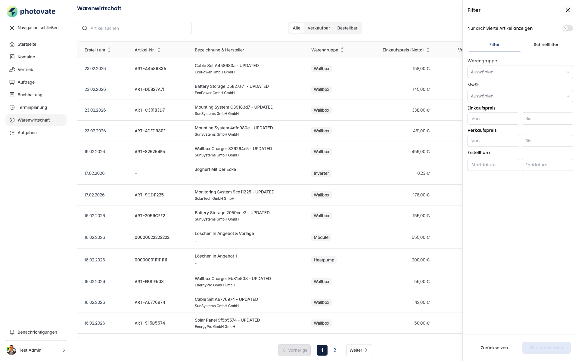 Artikelliste mit Bearbeitungsfunktion und Filtern.