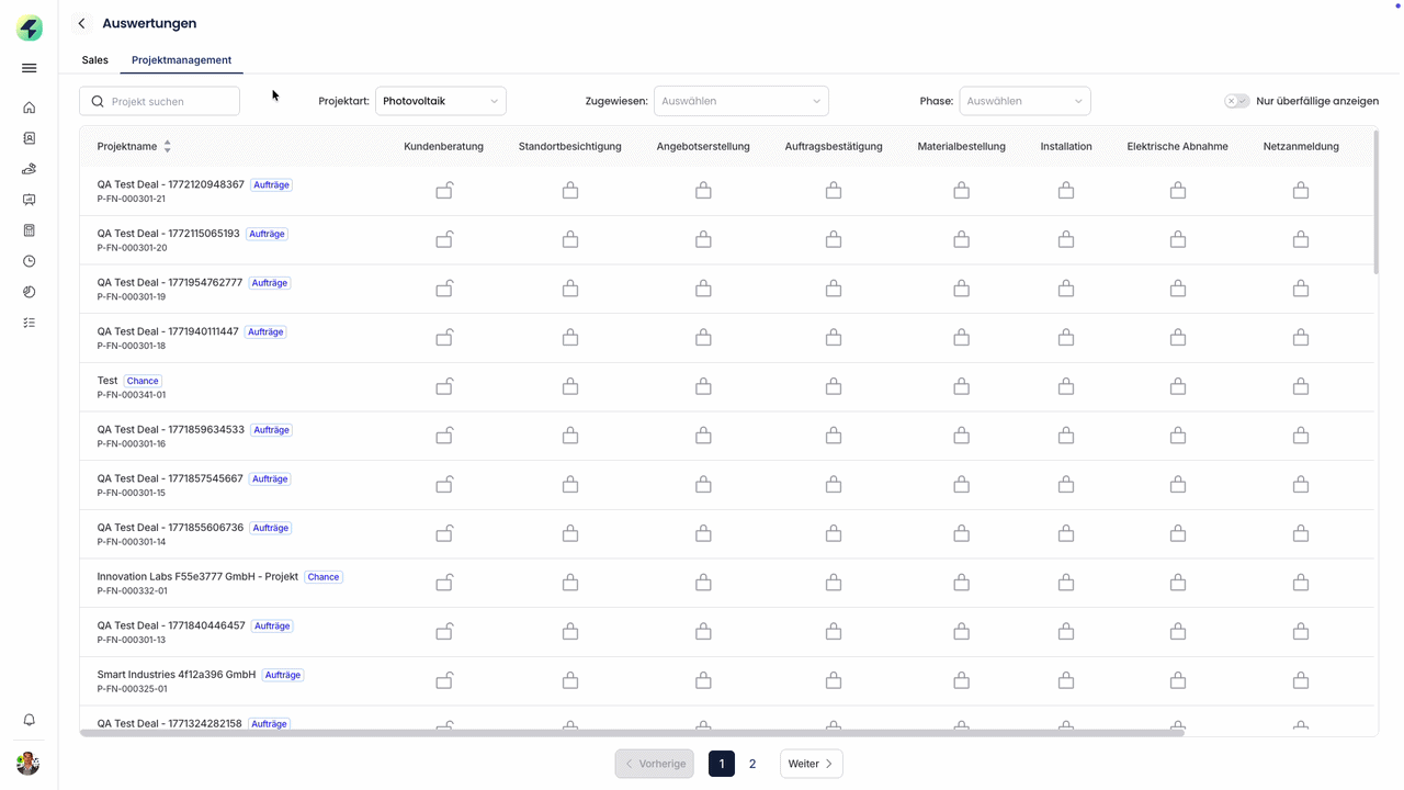 Filtern Sie - wenn gewünscht - nach der Projektart, dem zugewiesenen Mitarbeiter, der Phase oder nach "nur überfällige anzeigen"