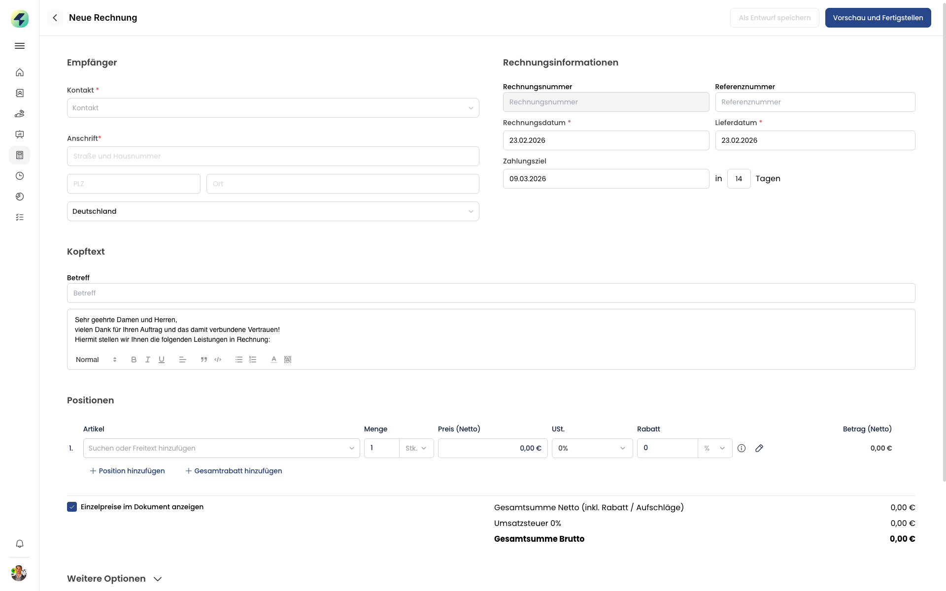 Sobald Sie den Empfänger und die Rechnungsinformationen erfasst haben, ist die Grundlage für Ihre Rechnung gelegt. Im nächsten Schritt befüllen Sie die Rechnung inhaltlich, dazu gehören der Kopftext, die einzelnen Positionen, weitere Optionen wie Skonto und Währung sowie der Fußtext. Alle Details dazu finden Sie im Artikel Rechnungspositionen und Inhalte erfassen.