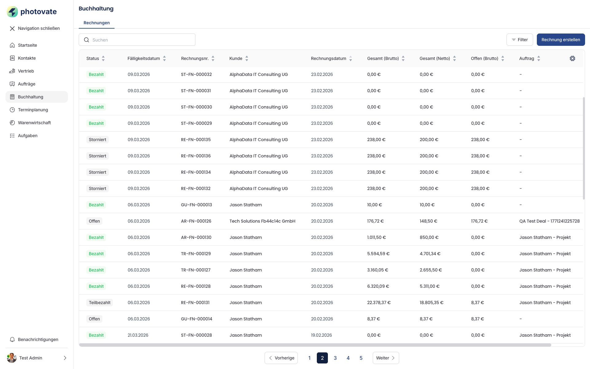 Die Rechnungsübersicht im Modul Buchhaltung ist Ihre zentrale Anlaufstelle für alle Rechnungen in Photovate.